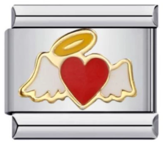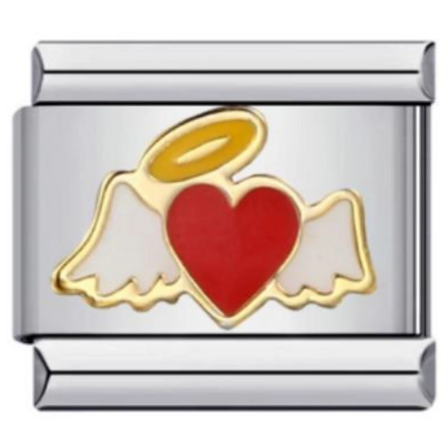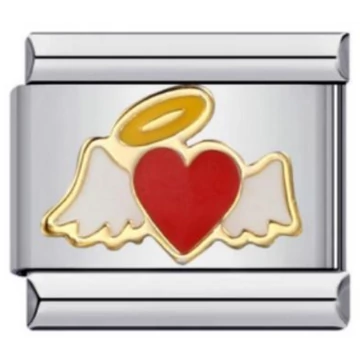 Angyal szárnyakkal és szív motívummal díszített italian charm, arany szegéllyel. Stainless steel alap, tartós, különleges jelentéssel bíró darab. Italian charm bracelethez kompatibilis, ajándéknak is gyönyörű.