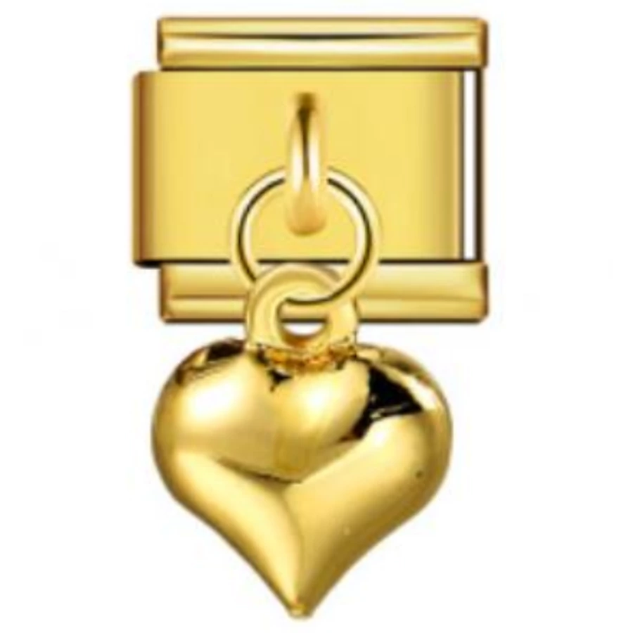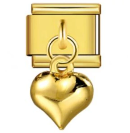Teljes arany tónusú (arany színű alap + arany szív medál) függős italian charm. Rozsdamentes acélból készült, tartós és látványos. Italian charm bracelethez kompatibilis – extra fényes, statement darab.