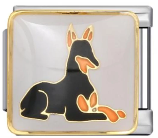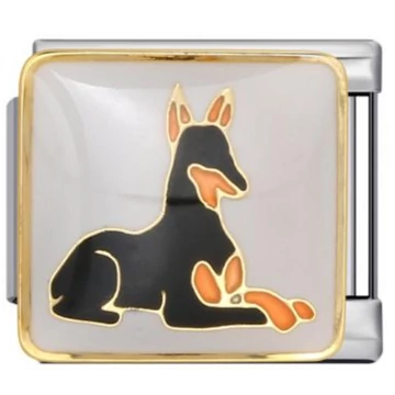 Doberman sziluettes, elegáns kutya mintás italian charm. Stainless steel alapanyag, arany szegélyes kerettel – stílusos és időtálló. Italian charm bracelethez kompatibilis, kutyás kollekciókba ideális.