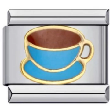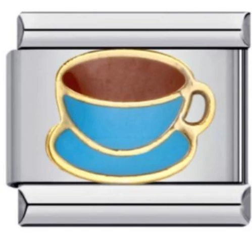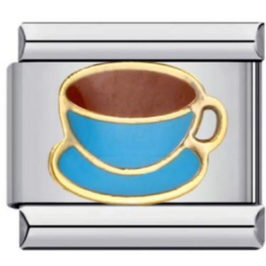 Kávéscsésze motívumos italian charm kék zománc részletekkel és arany szegéllyel. Rozsdamentes acél alap, tartós kialakítás. Italian charm bracelethez kompatibilis – cuki, hétköznapi kedvenc darab.