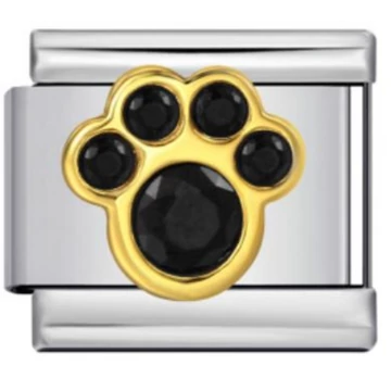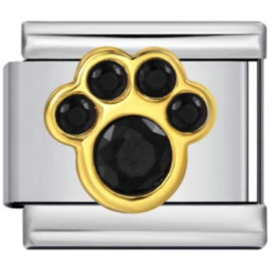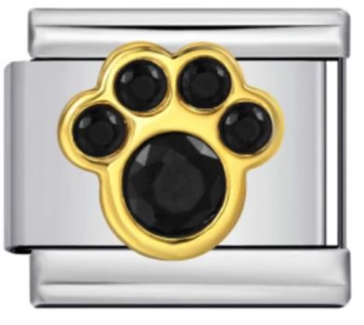 Arany színű kerettel és fekete köves díszítéssel készült mancs mintás italian charm. Stainless steel alapanyag, strapabíró és stílusos. Italian charm bracelethez kompatibilis, letisztult, elegáns darab.