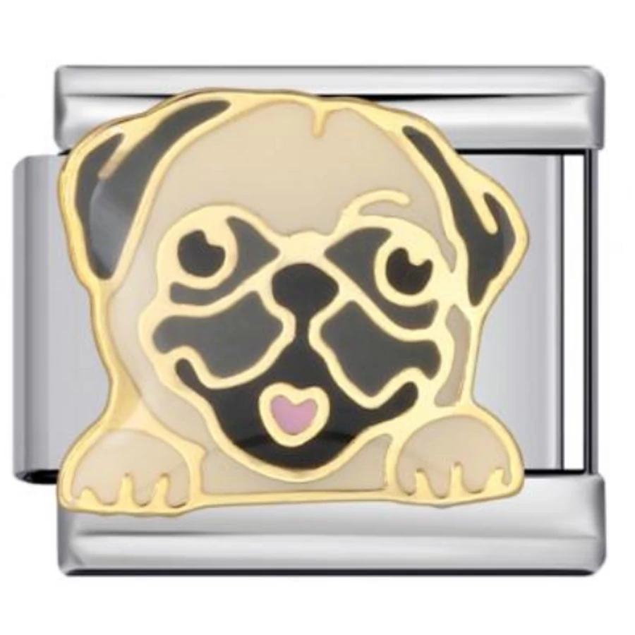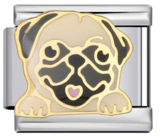 Mopsz (pug) arc mintás italian charm, kedves megjelenéssel és apró szív részlettel. Stainless steel alapanyag, arany szegéllyel – tartós és aranyos. Italian charm bracelethez kompatibilis, kutyás összeállításokhoz imádnivaló.