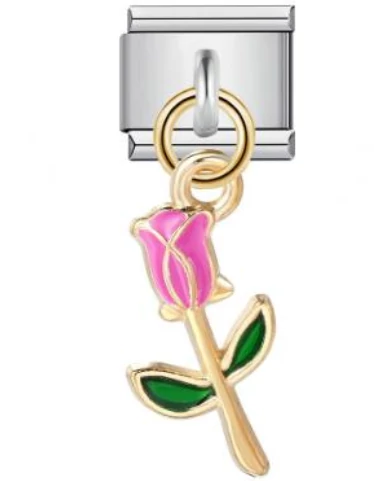 Rózsaszín rózsa medállal díszített függős italian charm zöld levél részletekkel. Rozsdamentes acél alapanyag, tartós kivitel. Italian charm bracelethez kompatibilis – romantikus, nőies darab.