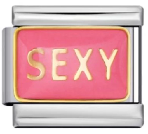Rózsaszín alapon arany hatású „SEXY” felirat – játékos, feltűnő italian charm. Rozsdamentes acél alapanyag, tartós viselet. Italian charm bracelethez kompatibilis, party/statement összeállításokhoz ideális.
