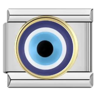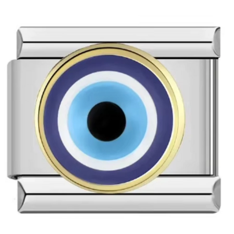 Ikonikus Szerencseszem (Evil Eye) olasz charm aranyszín peremmel. Klasszikus 9 mm moduláris kompatibilitás, tartós nemesacél és színes zománc.